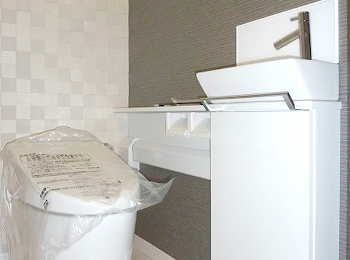 | トイレ交換前写真です。既存のトイレは、手洗い付きのタンク式便器でした。 | あくまでもフリーでプランしたトイレのリフォームイメージです。 |