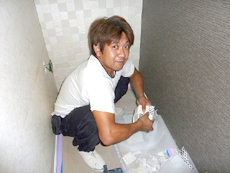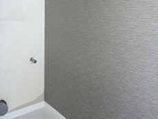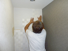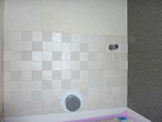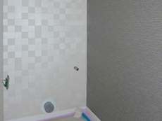 | 正面向かって右側の壁はポイント張りをさせていただきました。 | エコカラットを張る前の様子です。巾木(壁と床の境目)は既に塩ビシート被覆張りの化粧巾木に交換済みです。 | 壁給水部分や壁排水部分があるところから張り始めました。 |